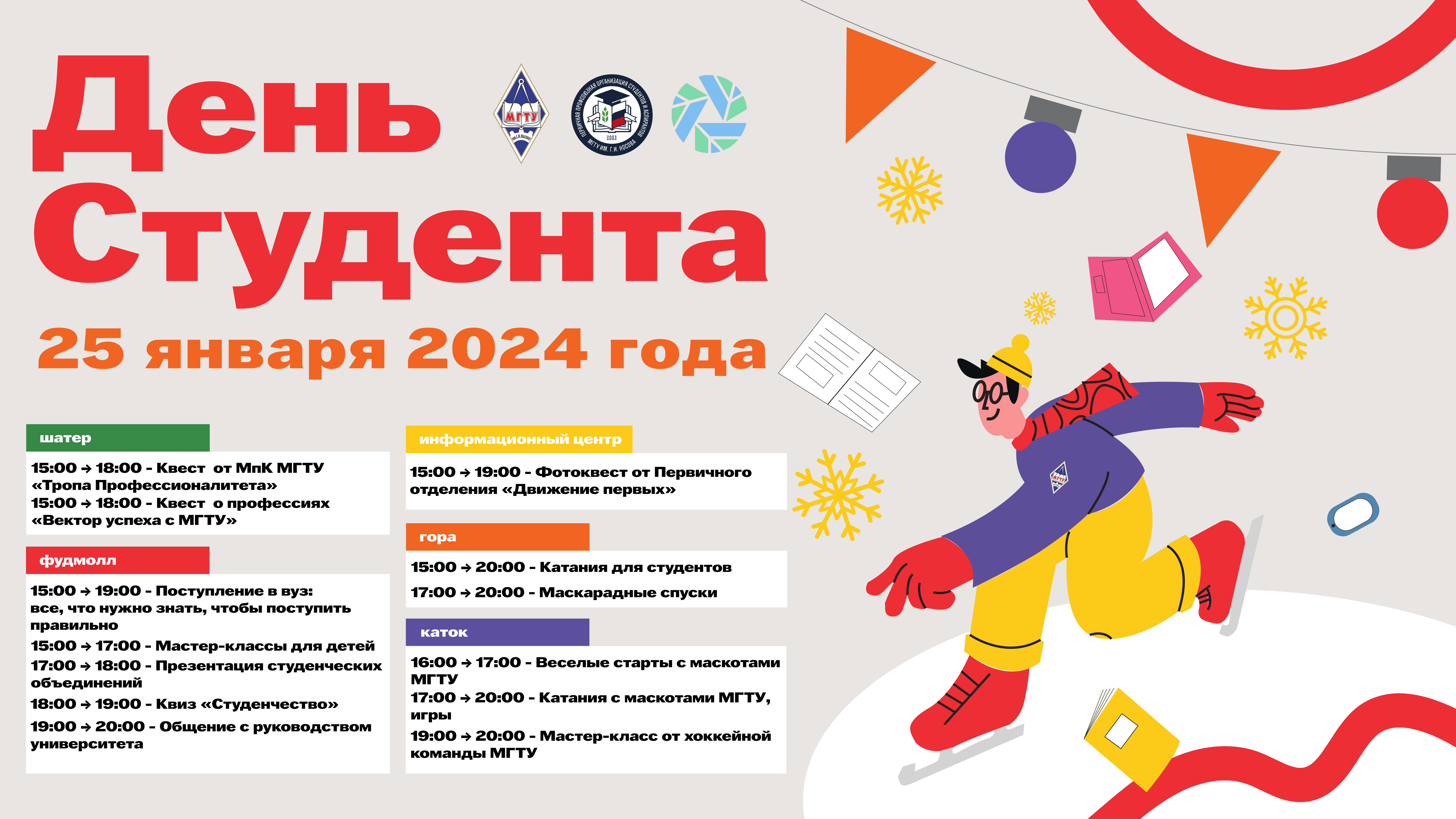В 17:00 пройдут катания с ректоратом МГТУ и розыгрыши призов. Для фанатов хоккея состоится мастер-класс от хоккейной команды МГТУ «Стальные сердца», где можно будет узнать полезные лайфхаки для игры на льду.