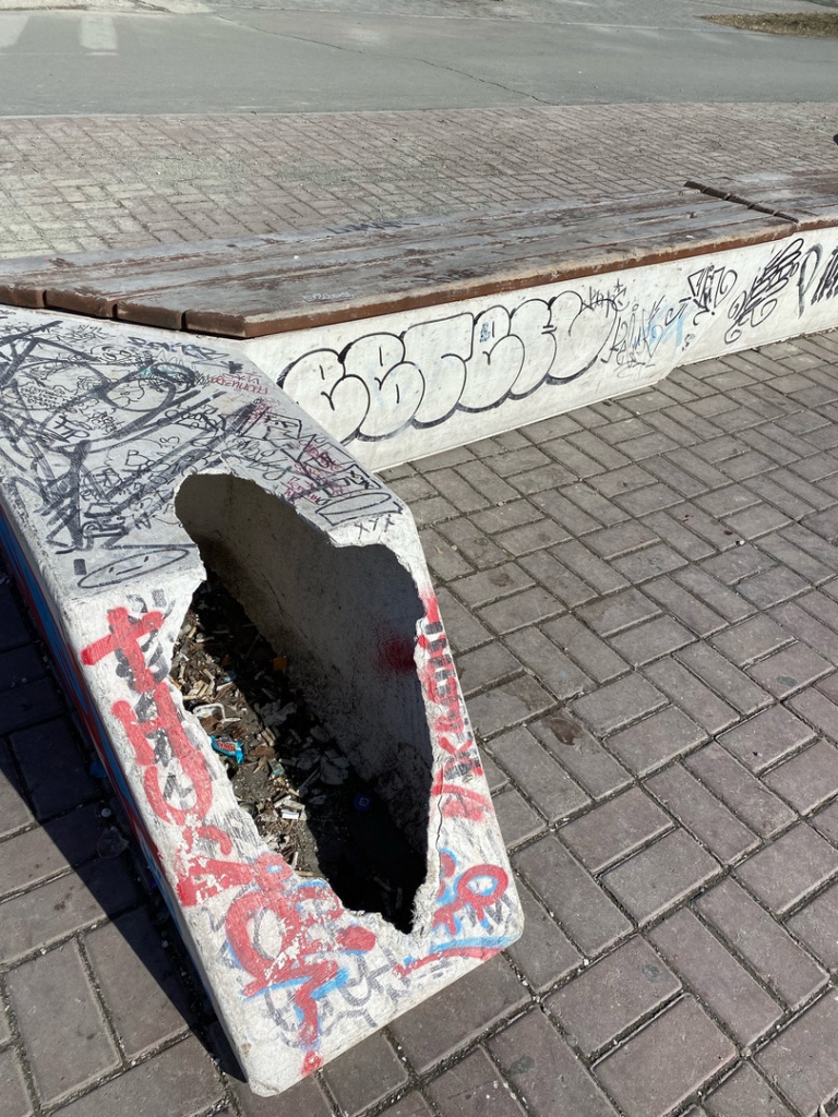 Эта дырка в "малой архитектурной форме" на отремонтированной пешеходной зоне "Бродвея" становится всё больше.