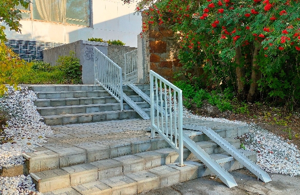 Со стороны улицы, от начала подъёма и до самого входного крыльца - новое покрытие (плитка), новые перила и новые направляющие для колясок.