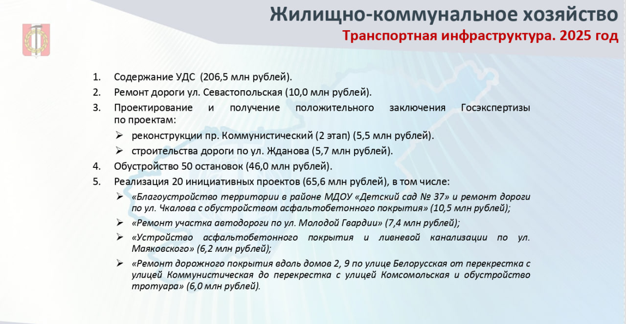 Запланированы ремонтные работы дороги и тротуаров, разработка проектно-сметной документации, обустройство остановок общественного транспорта.