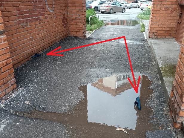 Вчера вечером шёл через арку (Гайдара, 24) и увидел эту дивную картинку. В разных концах под аркой валялись два тапка (указаны стрелочками). а в луже ещё и рыба лежала.