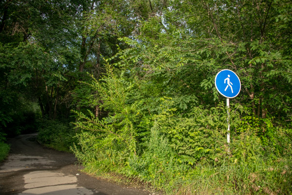 На машинах сюда нельзя, о чем сообщает знак «Пешеходная дорожка». Сзади остаётся цивилизация, мы же попадаем в дремучую чащу.