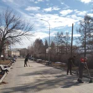 Занимаются этим сотрудники (МБУ) «Центр благоустройства». Территорию подмели, по дорожкам прошёл трактор с щёткой.