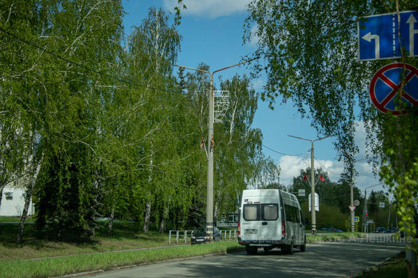 В пятницу отправились в еженедельную поездку по городу. Утренний снег полностью растаял. Из украшений ко Дню Победы, в основном, праздничные консоли и флажки на уличных опорах освещения.