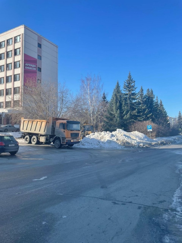 Осуществляется вывоз снега на Семёнова, 22. Идёт ликвидация лужи на Индустриальной.