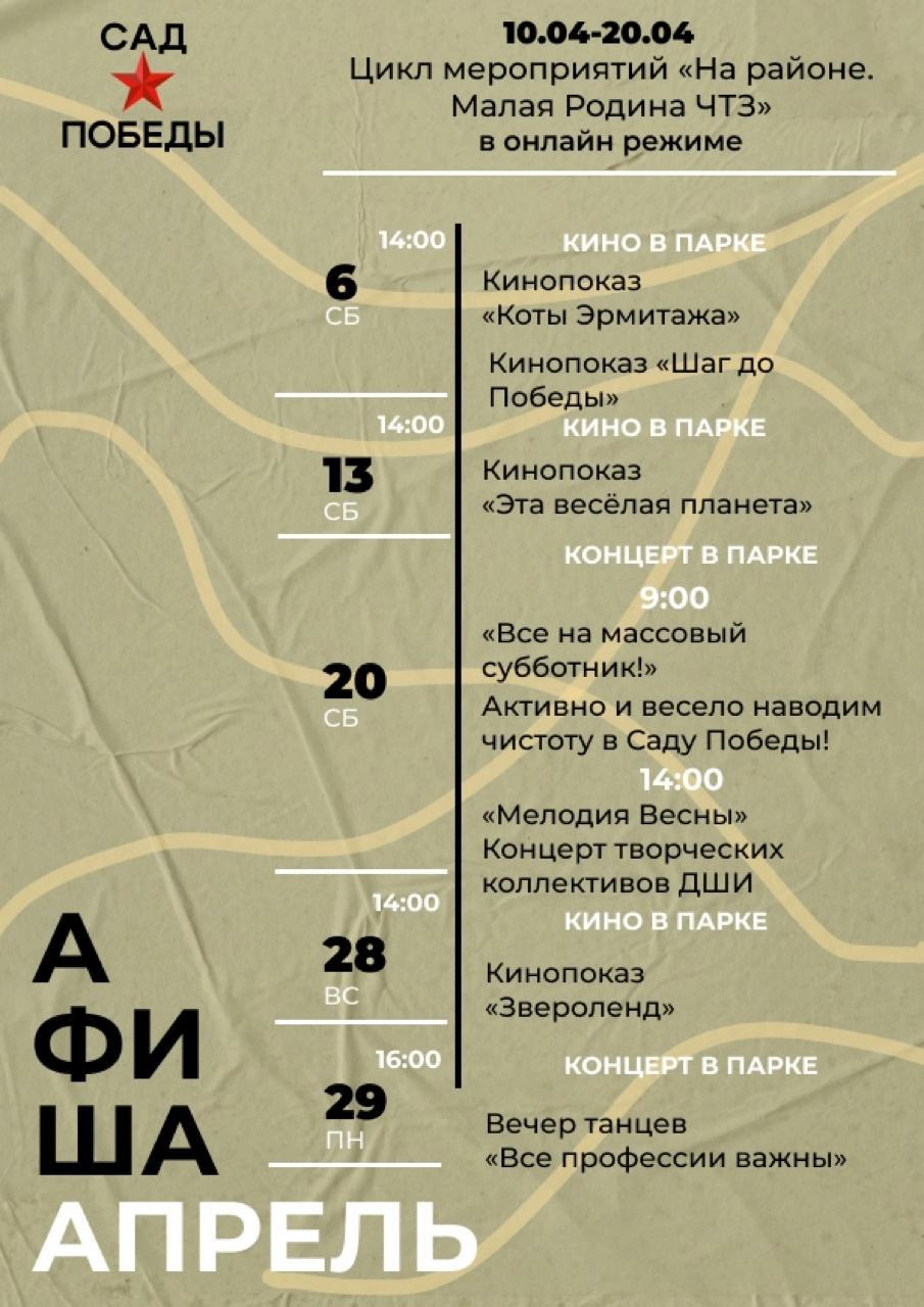 Выходные — это время, когда можно отдохнуть от рабочей недели и провести его с пользой. В парке «Сад Победы» в апреле стартует цикл мероприятий «На районе. Малая Родина ЧТЗ», включающий в себя кинопоказы на свежем воздухе и праздничные концерты.