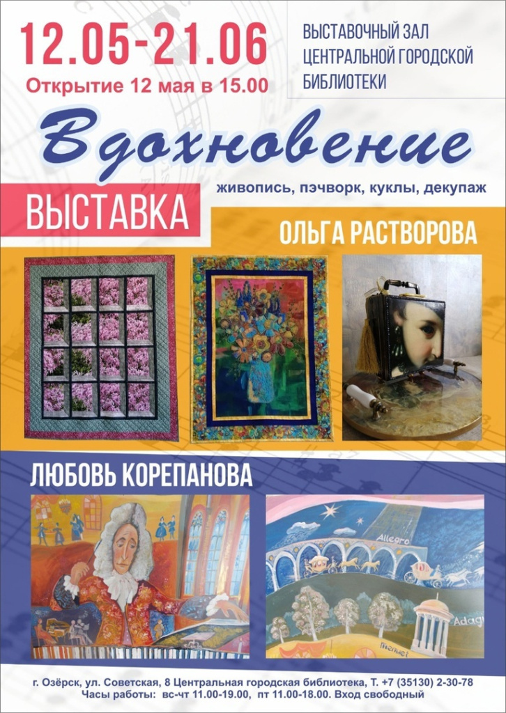 Центральная городская библиотека приглашает 12 МАЯ в 15 ЧАСОВ на открытие выставки Ольги Растворовой (Озёрск) и Любови Корепановой (Снежинск) "Вдохновение"