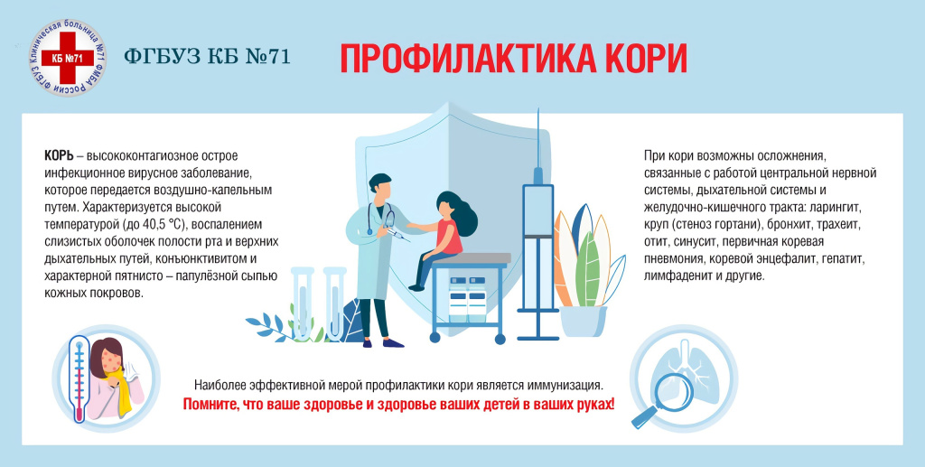 Корь наиболее опасна для детей, особенно младшего возраста. Мы настоятельно рекомендуем родителям заглянуть в календарь прививок и удостовериться, что ваш ребенок привит и не нуждается в ревакцинации. Поставить прививку можно в поликлинике по месту жительства или в медицинских кабинетах образовательных организаций . Также важно избегать массовых скоплений людей и контактов с больными.